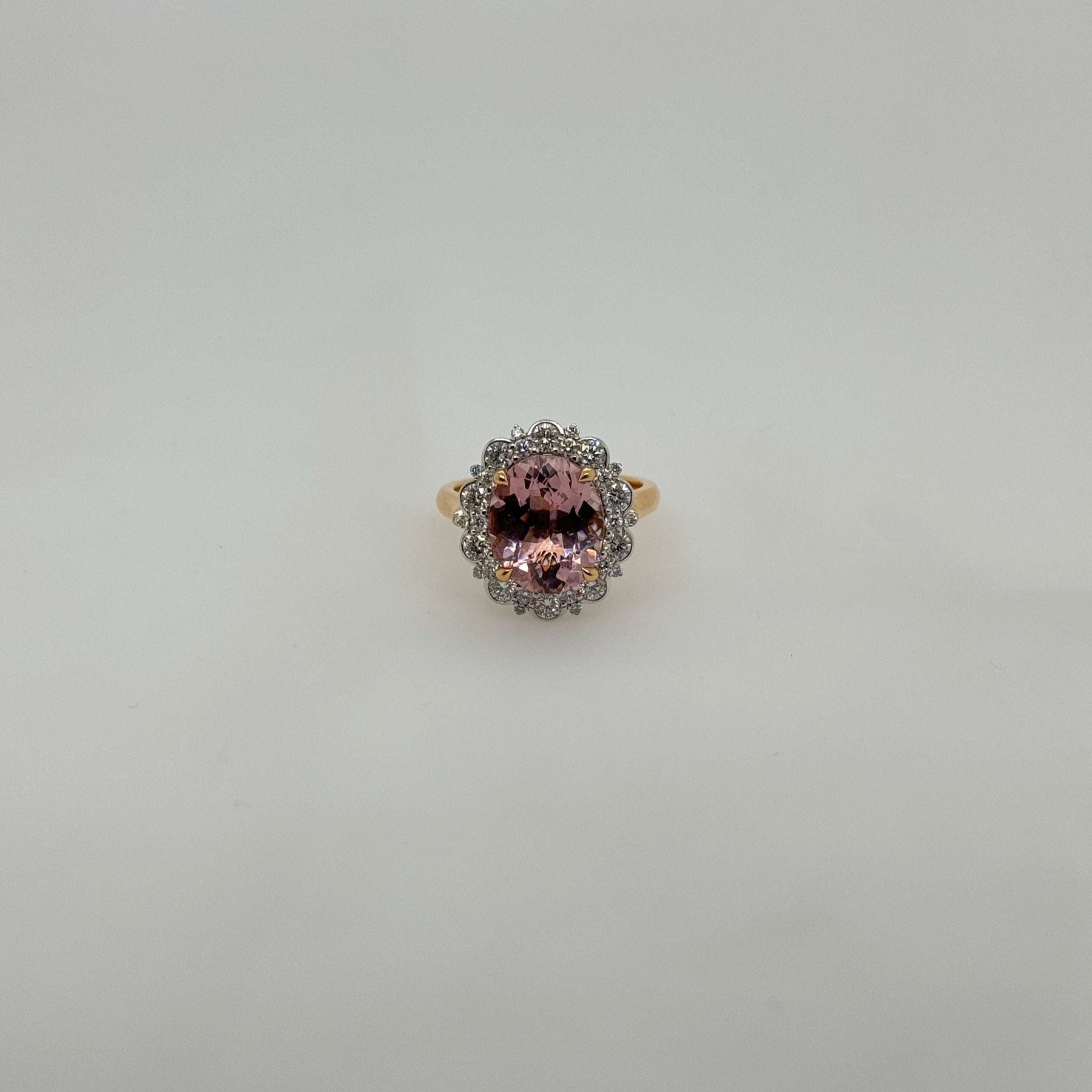 This exquisite ring features a breathtaking morganite gemstone at its centre, surrounded by a halo of sparkling diamonds. The elegant combination of 18ct rose and white gold enhances the beauty of the gemstones, creating a stunning piece that exudes sophistication and charm.
