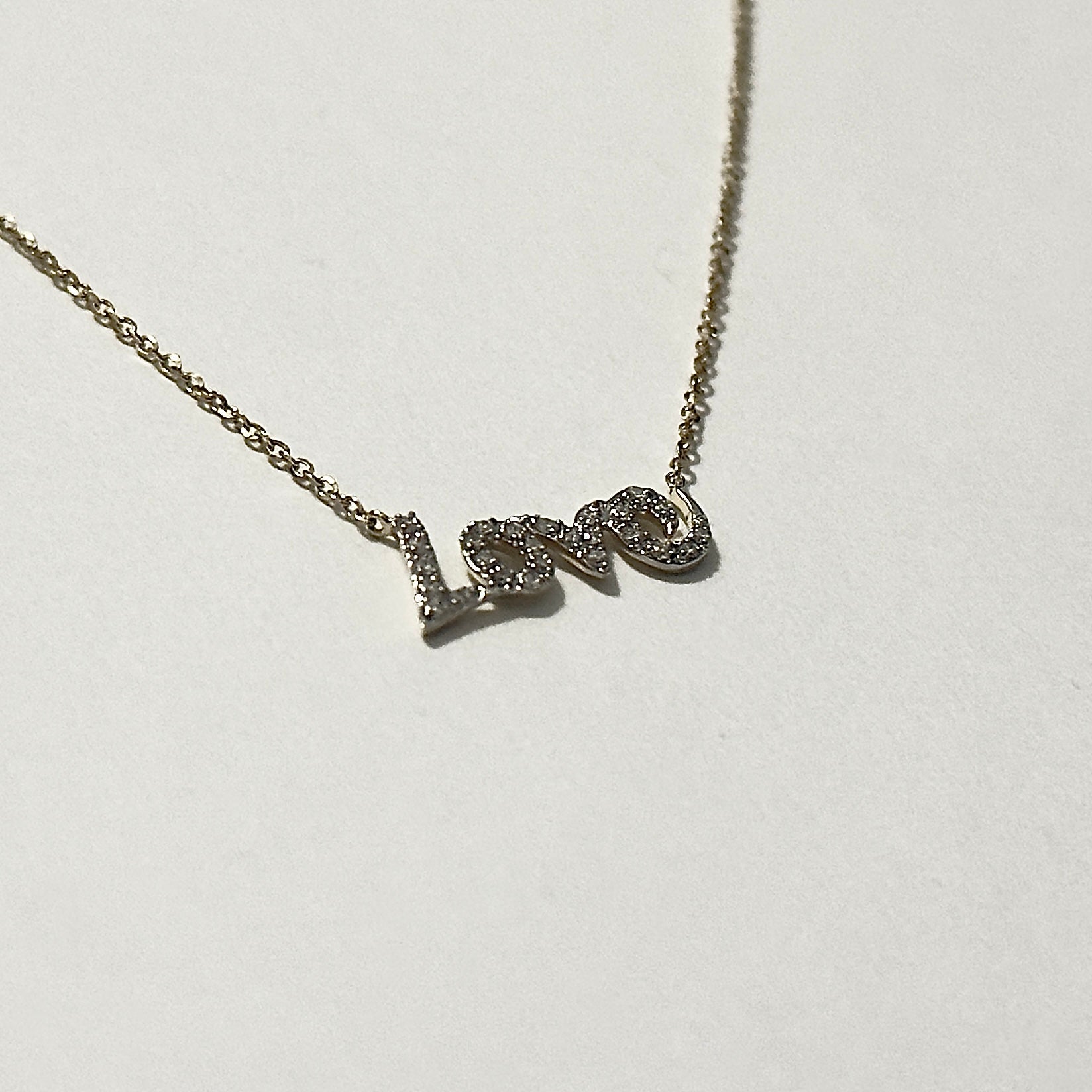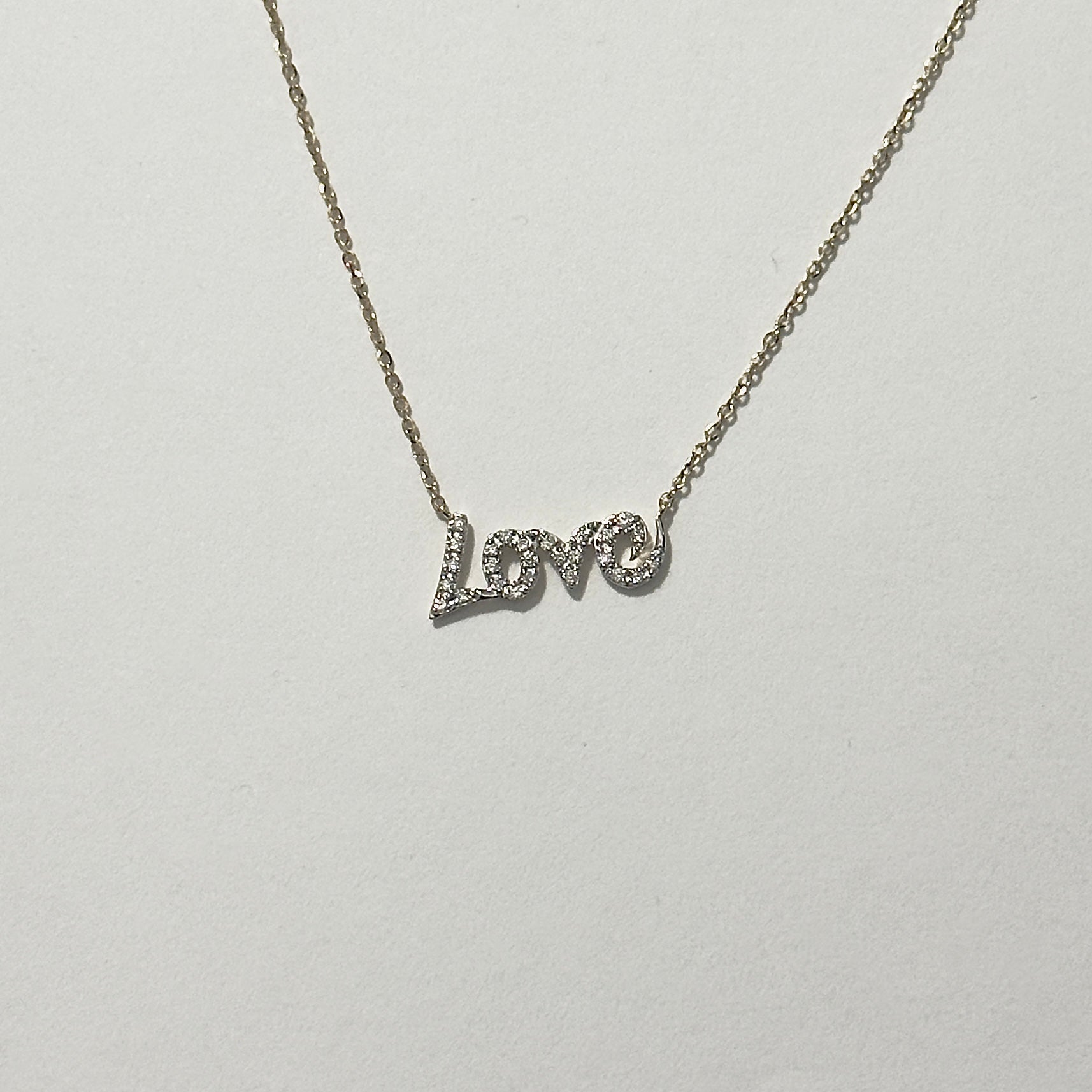 This 18ct yellow gold necklet consists of a fine link chain with a centrally positioned “love” motif in yellow gold, set with diamonds. The chain includes adjustment rings near the clasp and is secured with a matching yellow gold clasp.