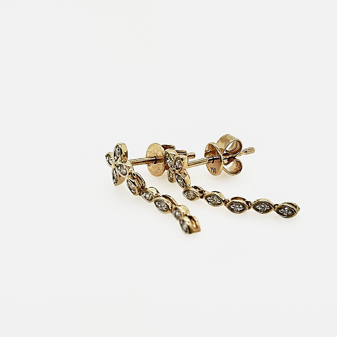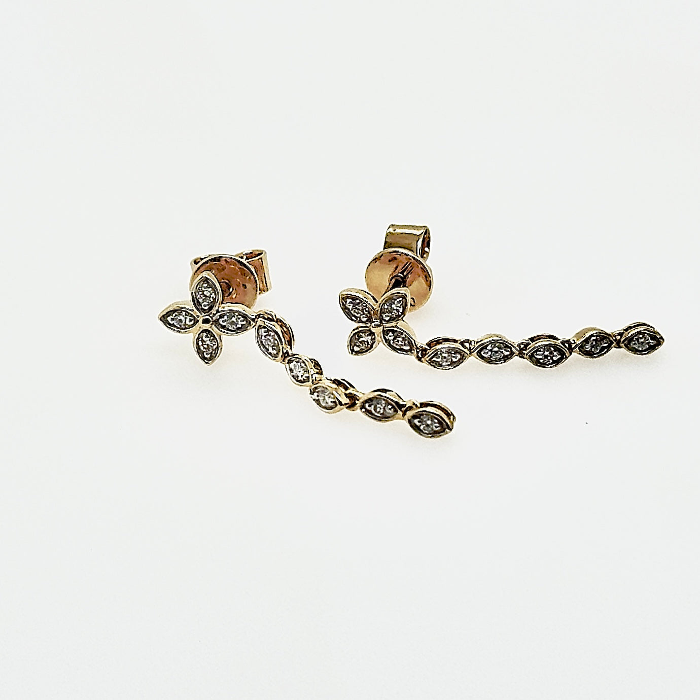 These 18ct yellow gold diamond drop earrings are introduced by a small floral diamond stud, with a fine diamond-set drop suspended below. The linked design creates gentle movement, giving the earrings a light and delicate appearance.