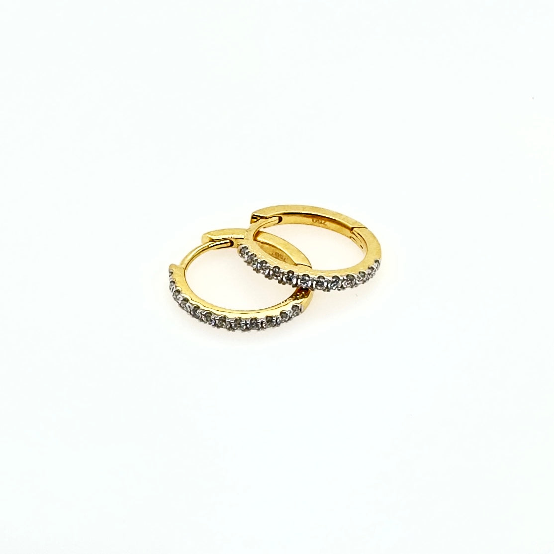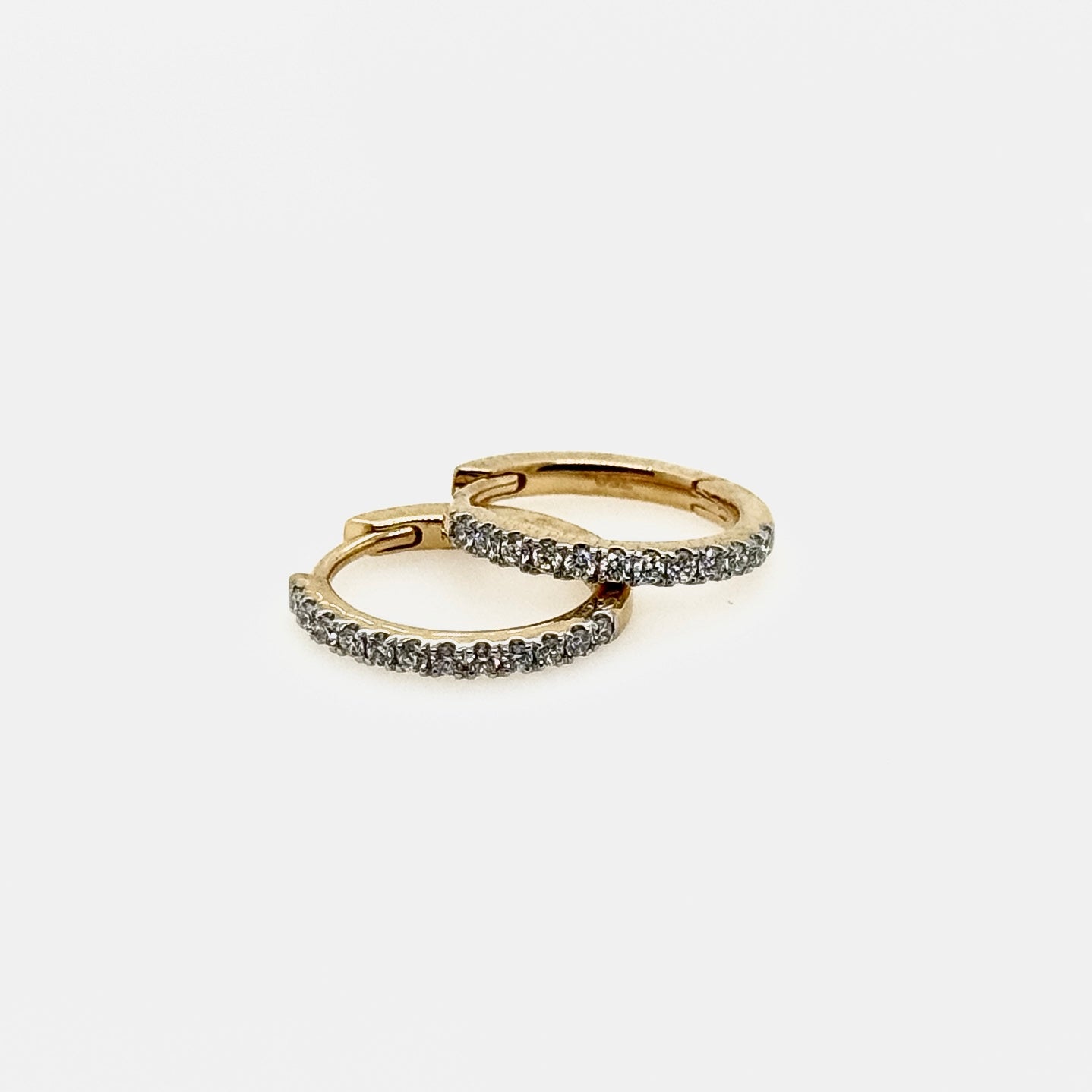 These 18ct yellow gold huggie earrings are designed as small hoop earrings with diamonds set along the front edge. The diamonds follow the curve of each hoop, adding a subtle line of detail across the visible surface. The earrings are formed in yellow gold and close neatly around the ear in a compact hoop shape.