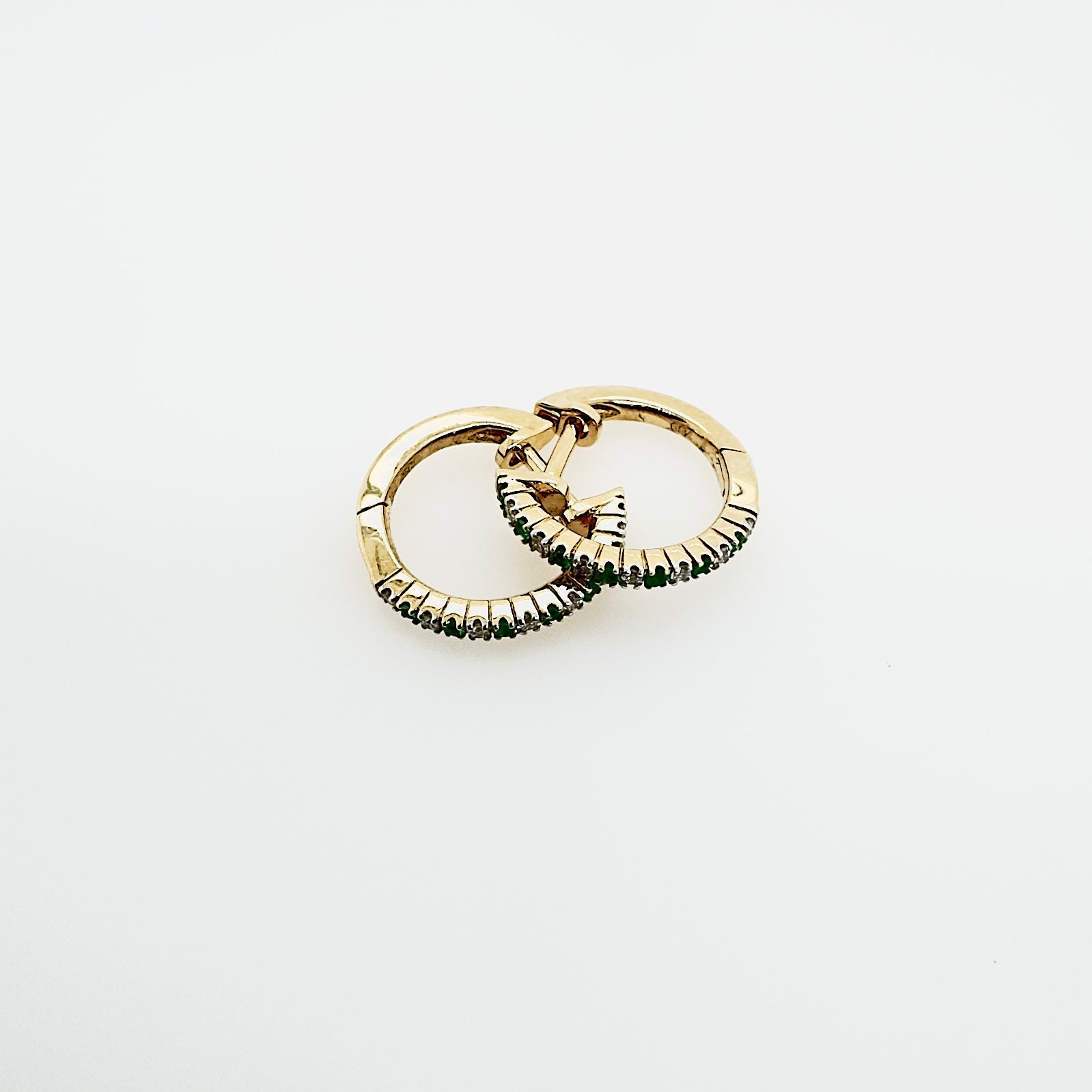 These 18ct yellow gold huggie earrings are shaped as small hoop earrings with a hinged closure. Each hoop features a row of emeralds and diamonds set along the front-facing edge, creating a band of alternating green and clear stones across the visible surface. The remaining sections of the hoops are formed in yellow gold, with the gemstones concentrated along the outer front curve.