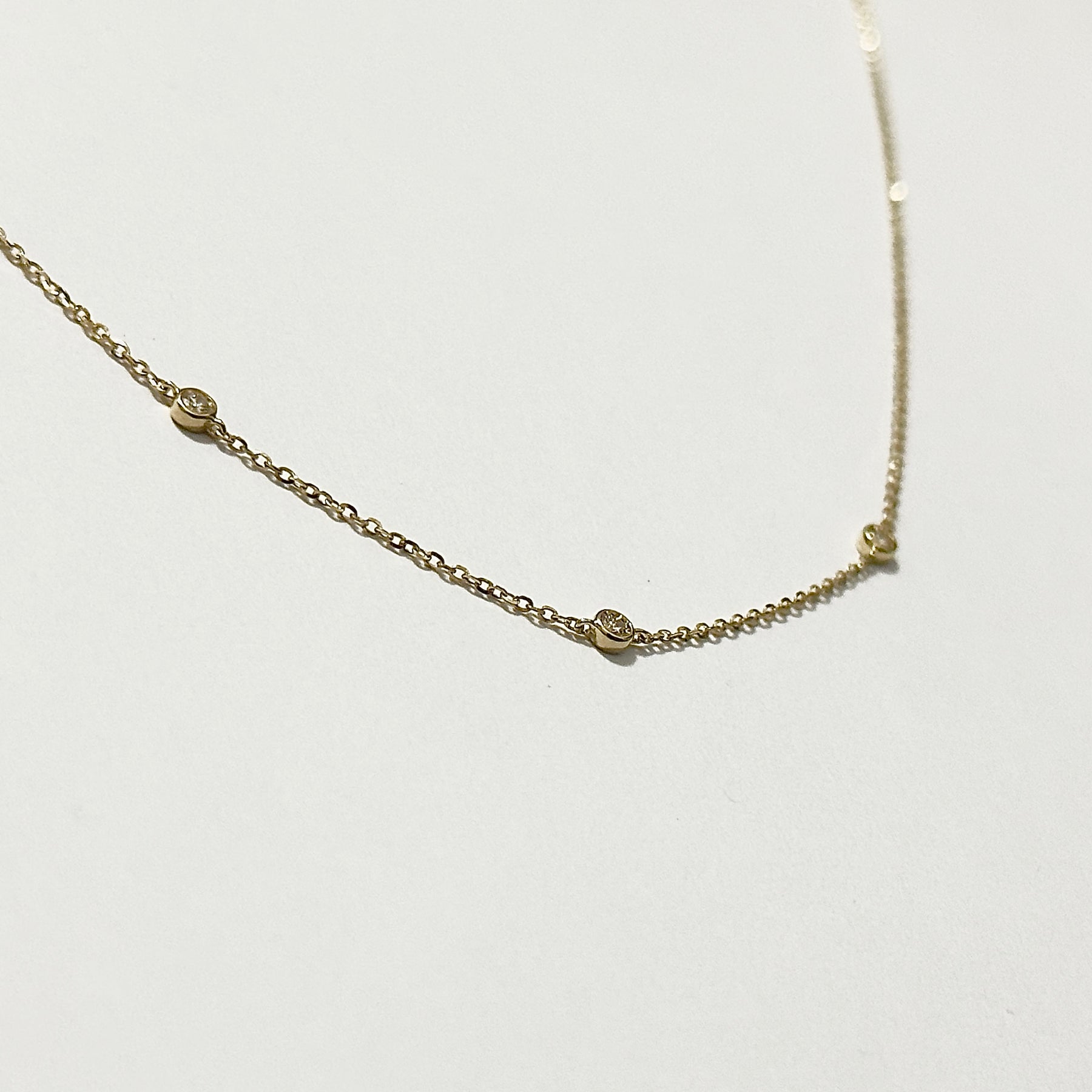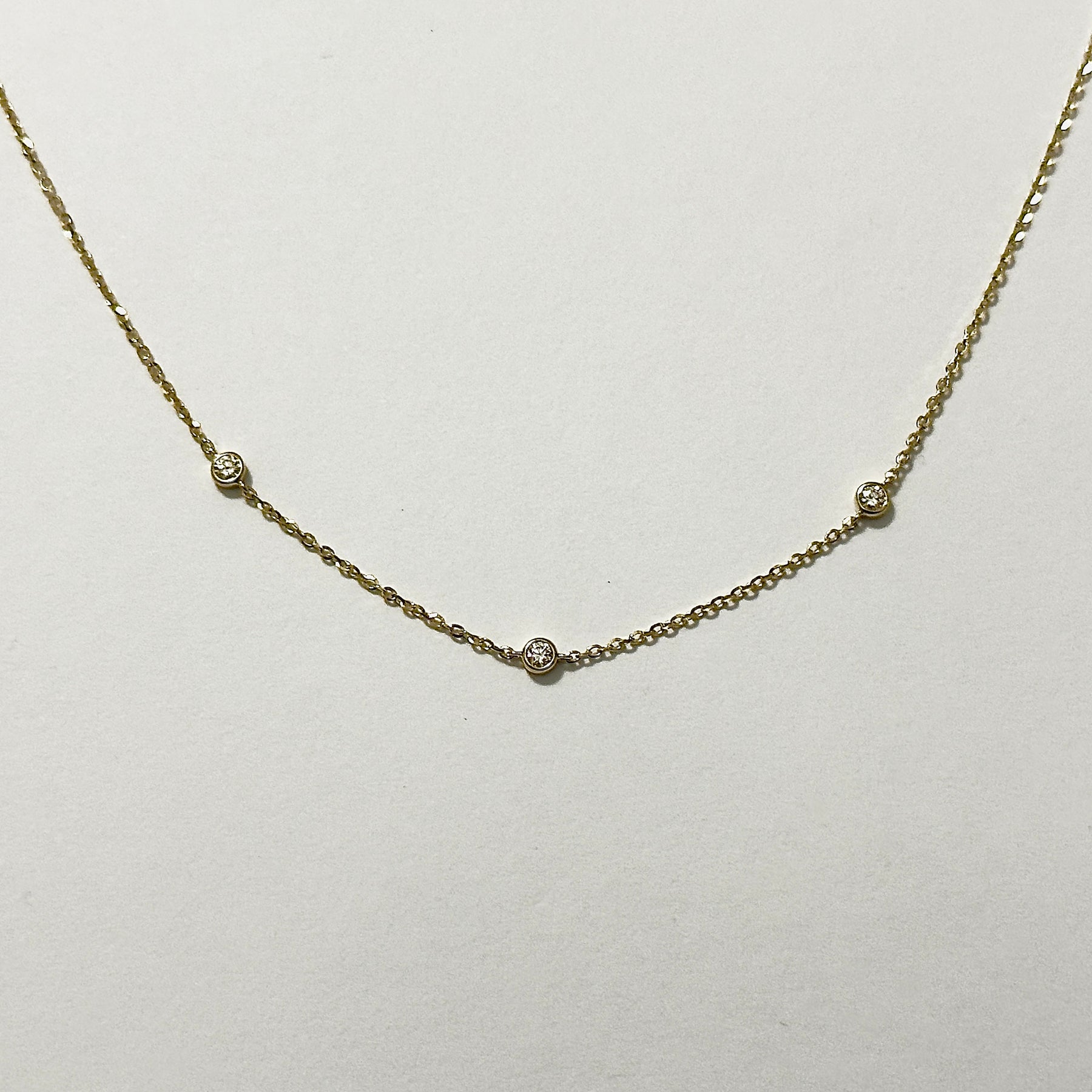 This 18ct yellow gold necklace is made with a fine yellow gold link chain, set with small diamonds spaced along its length. The diamonds are individually set at intervals, closely positioned, along the chain. The necklace includes adjustment rings near the clasp and is finished with a yellow gold clasp.