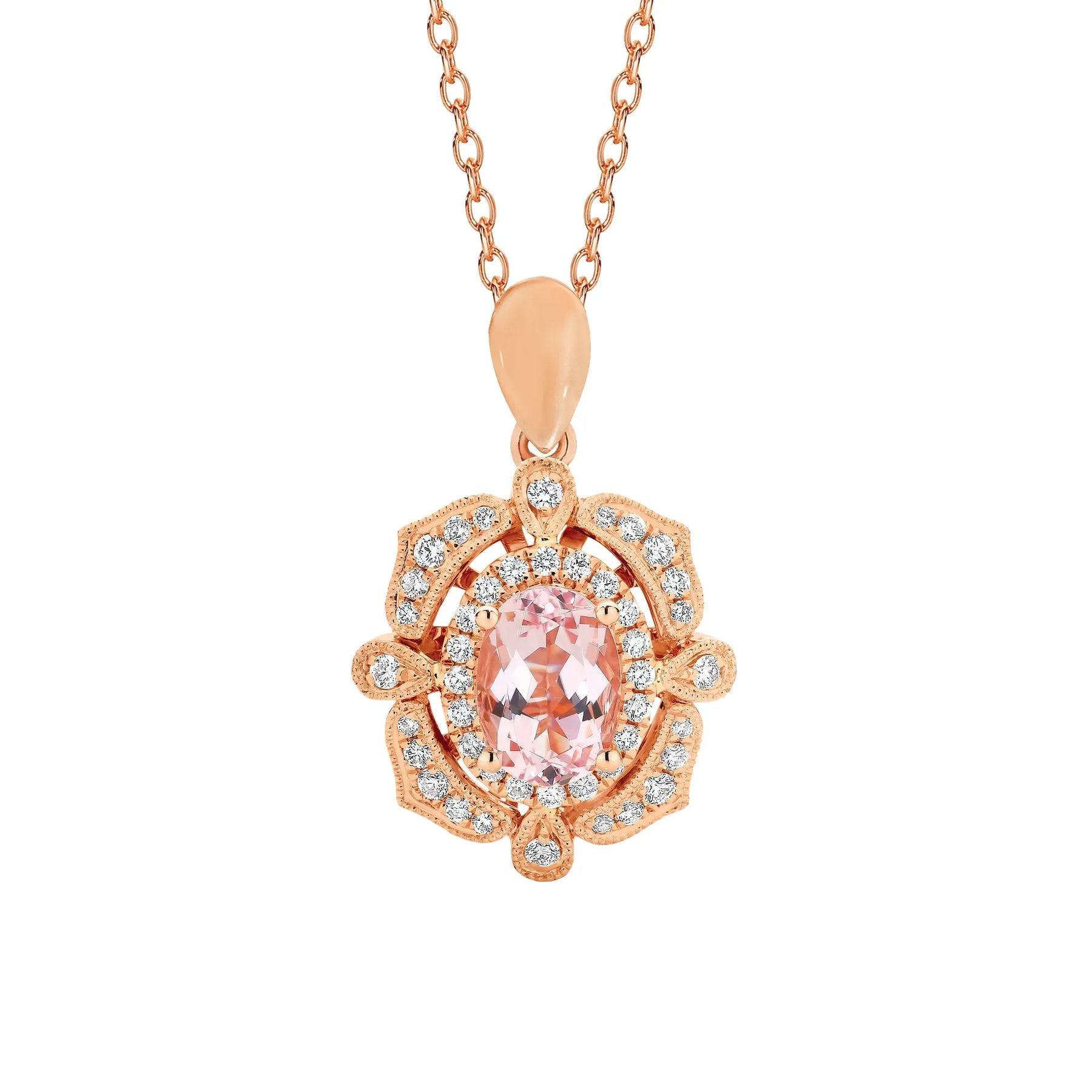 This 9ct rose gold pendant showcases an oval-cut morganite at its center, surrounded by a halo of sparkling diamonds.